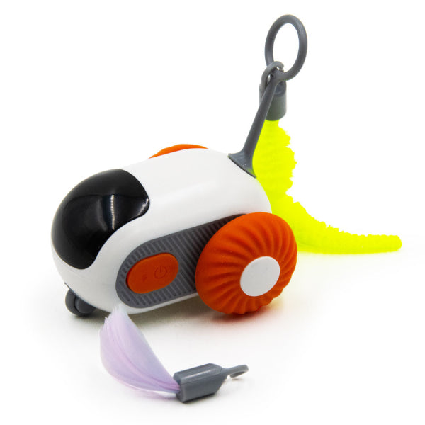 Uzaktan kumandalı robot kedi oyuncağı, kedilerin enerjisini atmasına ve aktif kalmasına yardımcı olan eğlenceli bir üründür. Şarjlı yapısı sayesinde pille uğraşmadan pratik bir kullanım sunar. Uzaktan kumandası ile ileri, geri, sağa ve sola yönlendirilebilir, böylece kedinizin ilgisini dinamik bir şekilde çekebilirsiniz. Üzerinde bulunan renkli kuyruk aparatı sayesinde uzun süre sıkılmadan oynanabilir. Yalnızca düz zeminler ve ince halılar için uygundur, kalın halılarda düzgün çalışmaz. Hafif ve kompakt yapısı sayesinde evde rahatça kullanılabilir. Kediler için fiziksel aktiviteyi teşvik eden, aynı zamanda etkileşimli oyun deneyimi sağlayan bu oyuncak hem eğlenceli hem de faydalı bir üründür.